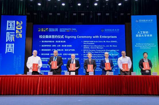 At the ceremony, Prof. Liang Yongsheng, vice president of SZTU, signed memorandums of understanding (MOUs) with the representatives of six foreign-invested enterprises and an association, including SwissCham South China, IMEDCO Tech (Shenzhen) Co., Ltd., BOCK Precision Components (Guangdong) Ltd., EF Electrical (Shenzhen) Co., Ltd., REHM Thermal Systems (Dongguan) Limited, VALEO Schalter und Sensoren GmbH, and WIK Shenzhen Domestic Appliances Co., Ltd. The signing ceremony with enterprises was facilitated by the active promotion of Prof. Holger Haldenwang, dean of the Business School, and Prof. Franz Raps, dean of the College of Urban Transportation and Logistics. The partnerships cover a range of cutting-edge fields such as advanced manufacturing, green energy and medical technology, marking a new stage of Sino-German collaborative innovation in industry, academia and research.